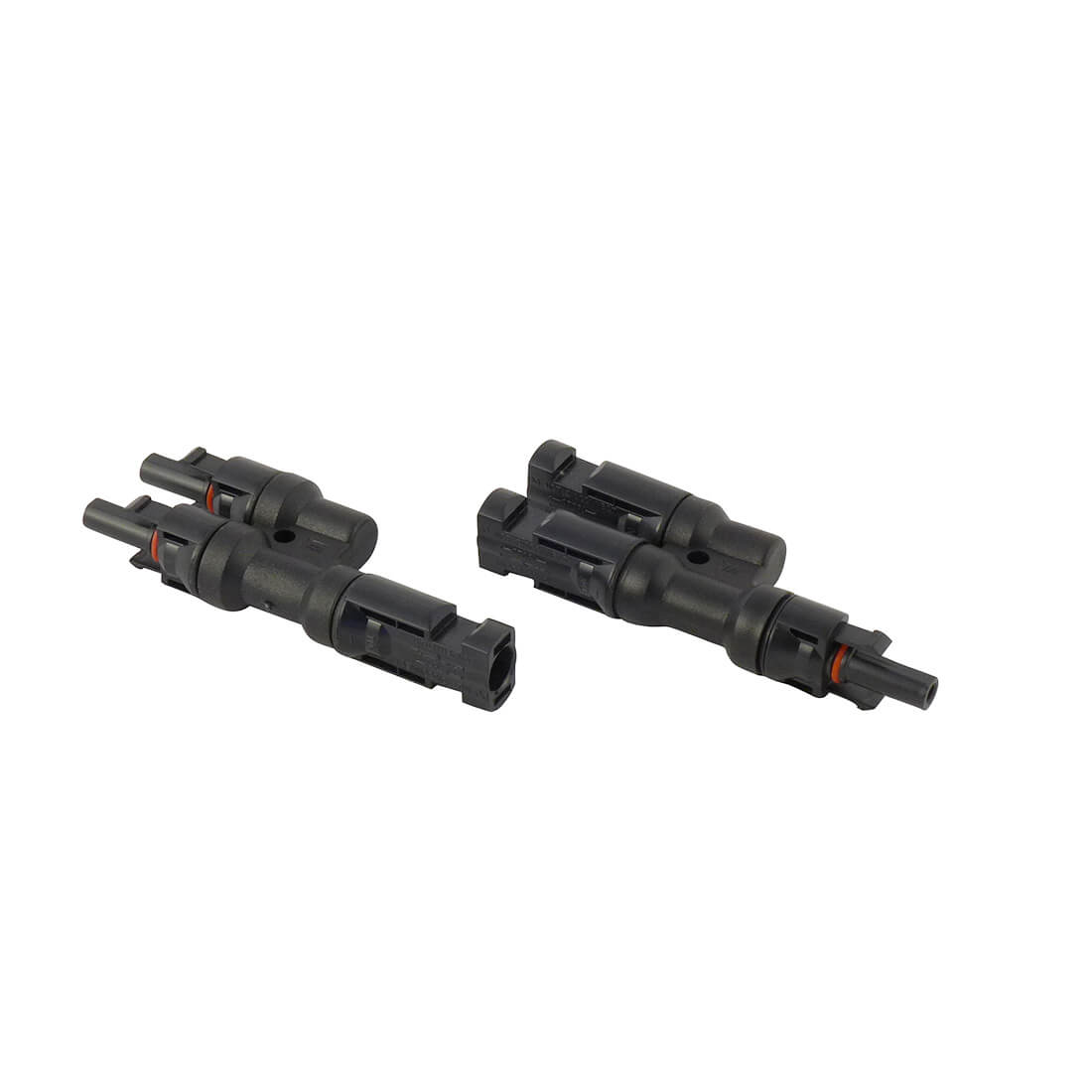 MC4-parallelconnector 2-op-1 voor eenvoudige parallelschakeling van zonnepanelen. Wordt geleverd als connectorpaar (vrouwelijk + mannelijk), TÜV-gecertificeerd en CE-goedgekeurd voor DC 1000 V / 30 A.
